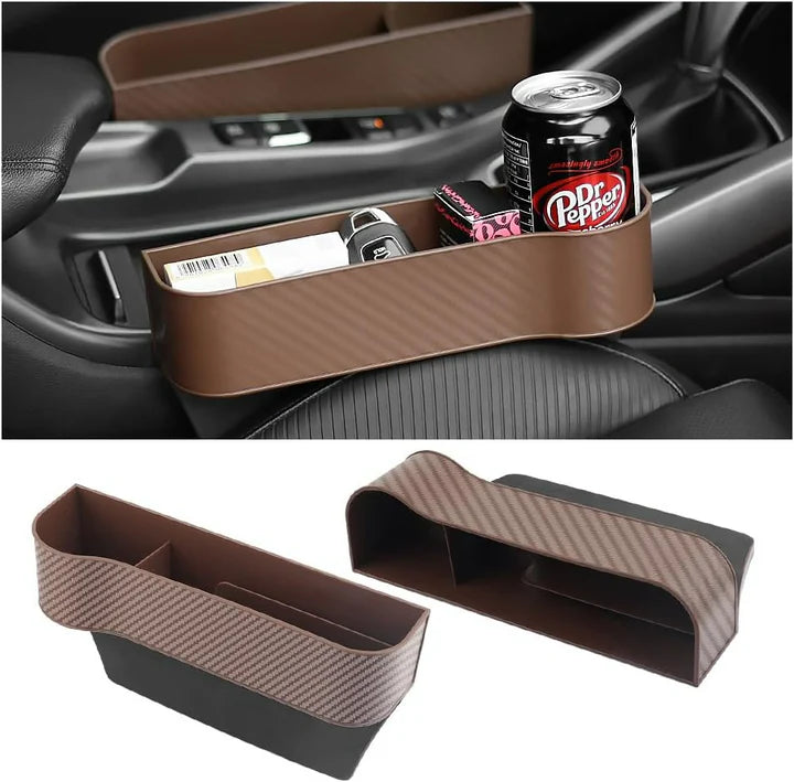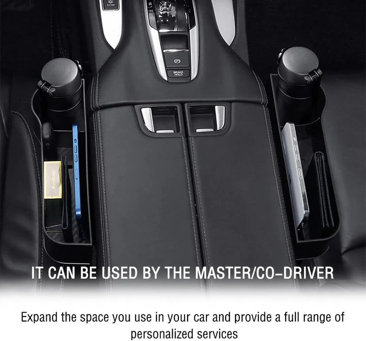 A car seat gap filler and organizer that prevents small items from falling, providing extra storage space for cups, phones, keys, and coins, ensuring a clutter-free and safe driving experience.